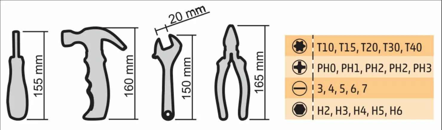 - Magnetischer Schraubendreher (155 mm) mit 20 Bits: Enthält die gängigsten Bit-Typen: Torx (T10, T15, T20, T30, T40), Phillips (PH0, PH1, PH2, PH3), Schlitz (3–7 mm) und Innensechskant (H2–H6).