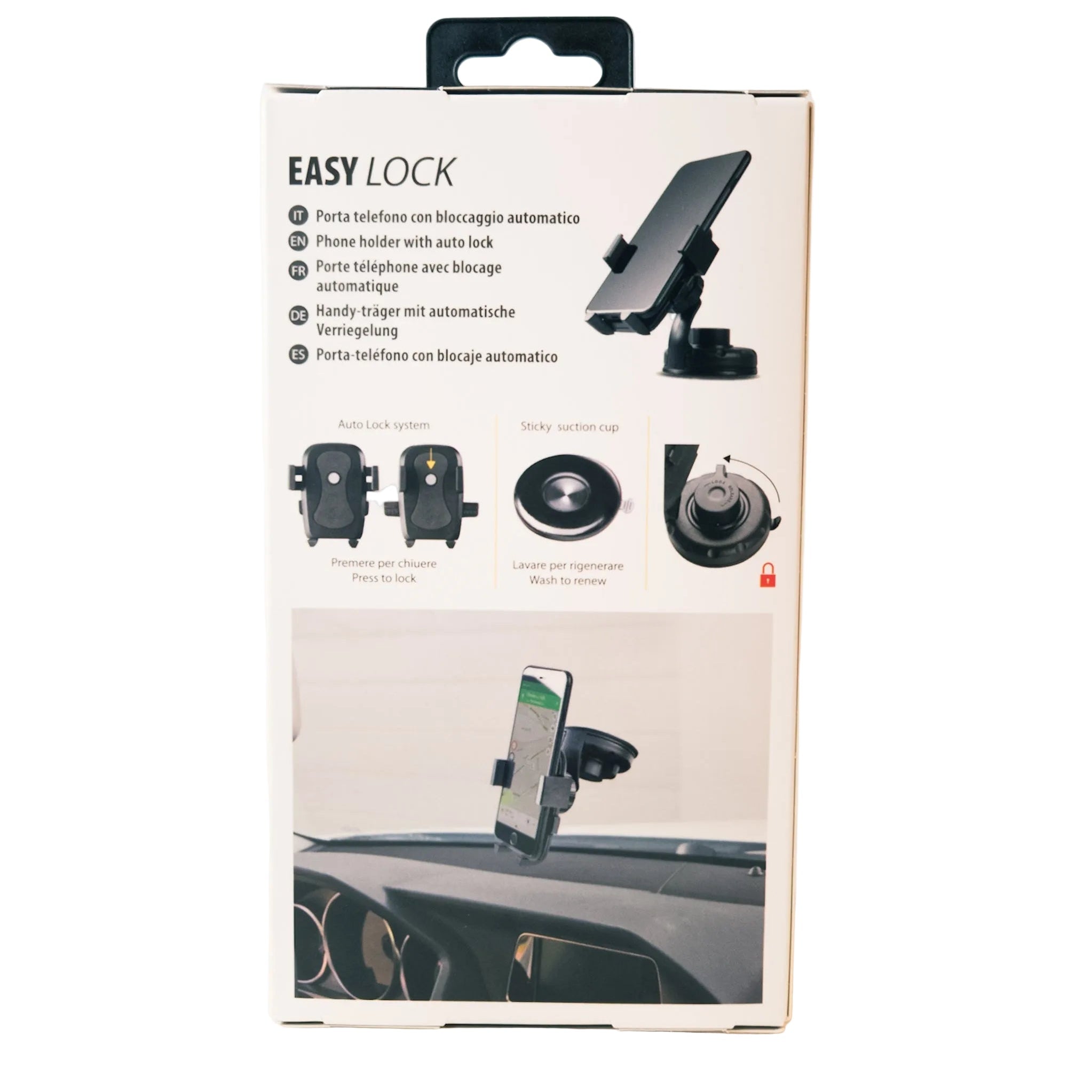 Soporte de móvil para coche con cierre automático Easy-Lock y ventosa adhesiva. Ajustable en ángulo, compatible con la mayoría de smartphones. Ideal para navegación y llamadas seguras en el coche.